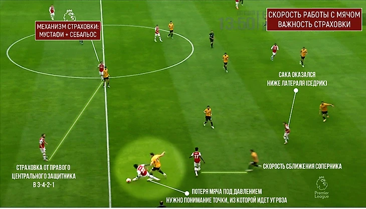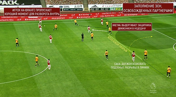 Нкетиа классно выдергивает страхующего в тройке центральных защитников «Вулверхэмптона», оголяя пространство за его спиной. Таким разрывом в линии нужно обязательно пользоваться, потому что их немного за матч: тебя могут не заметить свои, но предложение тут обязательно. Вина лежит не только на Сака, но и на человеке с мячом – пока Нкетиа выходит в недодачу, разворачивать атаку внутрь под рывки из глубины необходимо, даже чересчур рискуя.