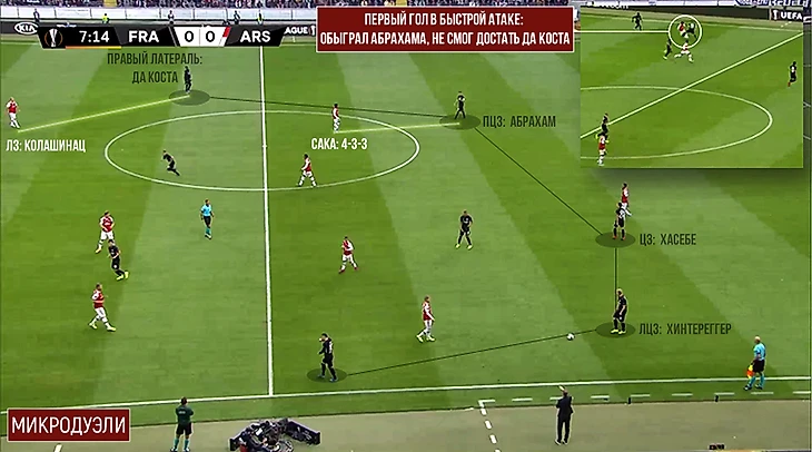 Здесь Сака действует против одного из тройки центральных защитников «Айнтрахта» (Абрахама), отдав латераля (Да Косту) Колашинацу. От этих микродуэлей зависит очень многое: кто кого переиграет, кто кому доставит больше неприятностей – Сака Абрахаму или Да Коста Колашинацу?