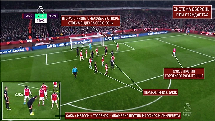 5 человек занимают зоны по створу на границе вратарской, а группа менее габаритных футболистов «Арсенала» нацелена на действия по вбегающей группе (выше – Магуайр + Линделеф), ее замедлению. В первую линию выдвинут Сака, а также Нелсон, Торрейра и Обамеянг, образуя живой щит. Получаются две линии (5+4) и Озил, контролирующий периметр/подбор.