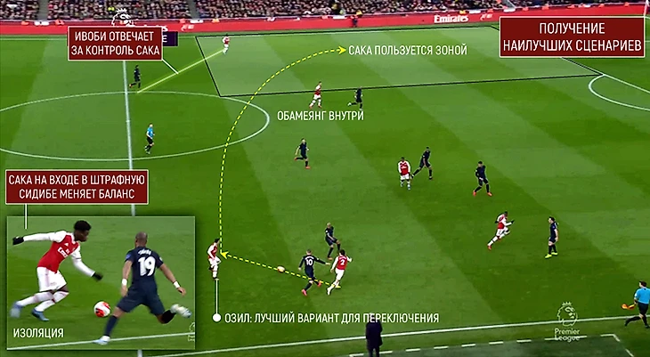 Опять прекрасные предпосылки: Ивоби далеко позади (сложно отыграть такое расстояние у быстрого Сака), Обамеянг сдал фланг в аренду, сместившись в центр, гектар пространства для включения, на мяче игрок, прекрасно видящий подобные зоны и умеющий оперативно разворачивать игру (Озил).