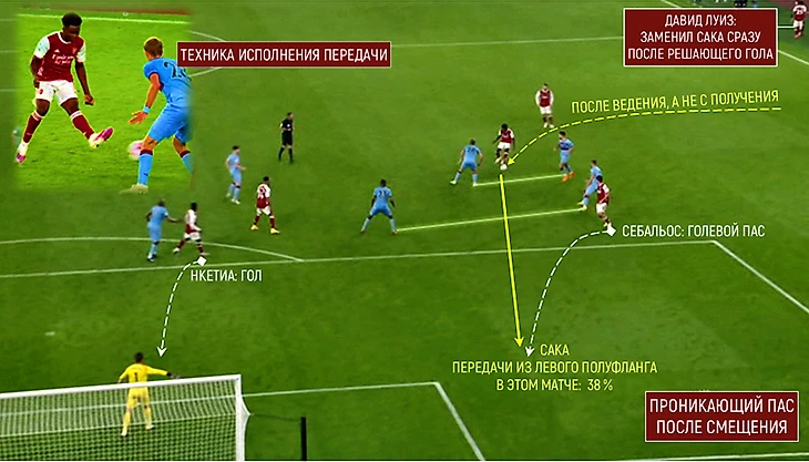 Аналогичным способом Букайо получил два голевых момента в игре. В следующем моменте от Сака требуются навыки центрального нападающего. Это не его прямая обязанность, но заполнение зоны за спиной Нкетиа – отличный метод вскрыть оборону: