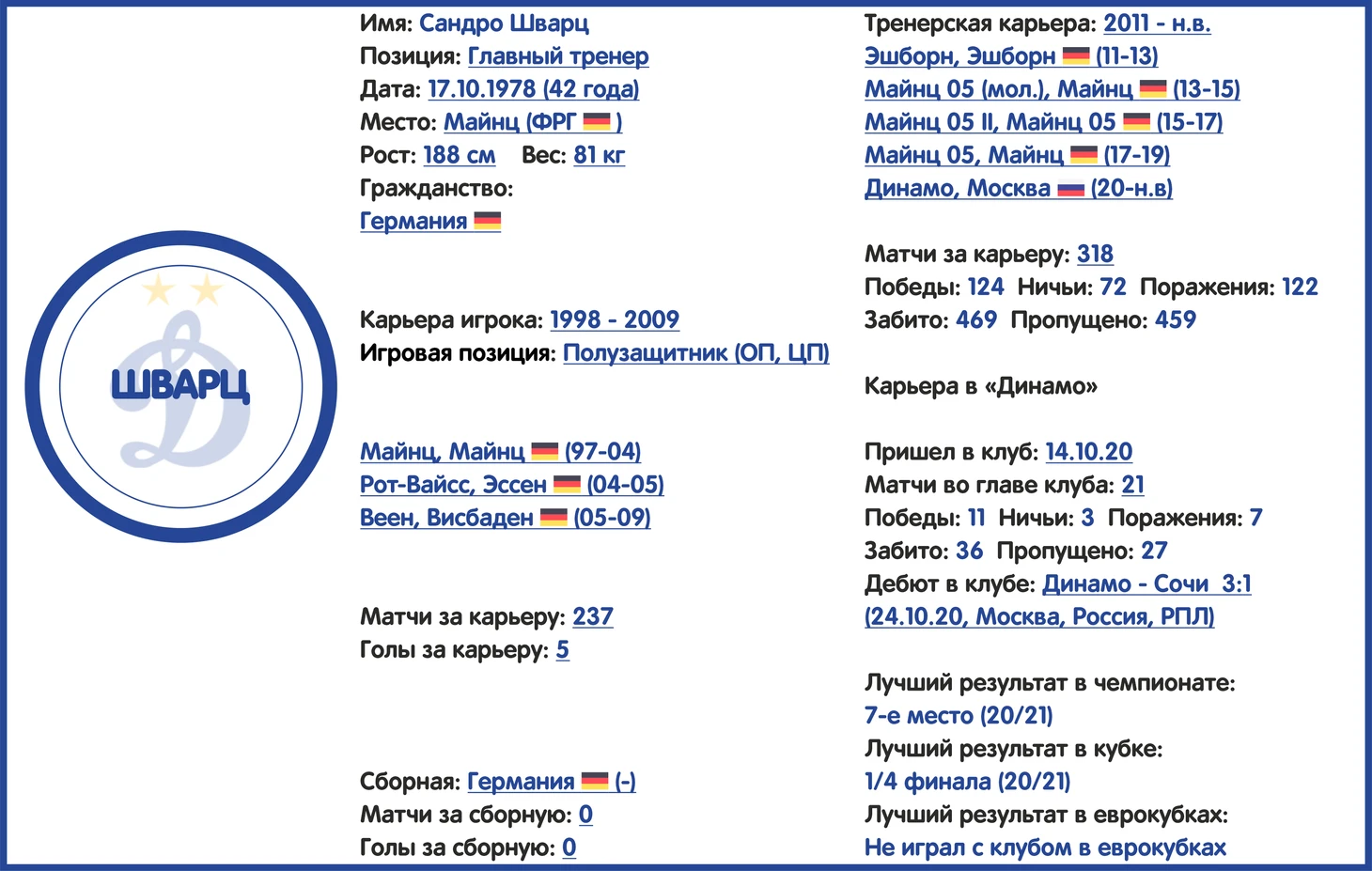 Немецкий специалист Сандро Шварц никогда не играл в футбол на высоком уровне (вся карьера главного тренера «Динамо» прошла преимущественно в командах низших немецких дивизионов), однако это совершенно не помешало ему стать одним из самых перспективных тренеров Германии на сегодняшний день.