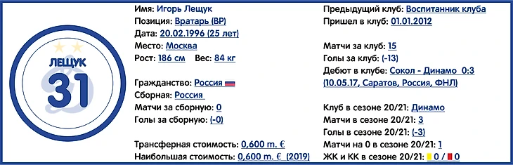 Многолетний страж ворот московского «Динамо» и его капитан. Уже почти 15 лет является незаменимым механизмом в динамовской футбольной машине (почти 300 матчей за основную команду). Провел 1 матч на недавнем Евро-2020 в составе сборной России.