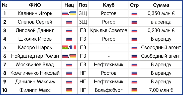 Помимо этого команда смогла трудоустроить своего проблемного немца Максимилиана Филиппа в «Вольфсбург» на полной основе (отбив порядка 7 млн €) и продала в «Крылья Советов» полузащитника Даниила Липового.