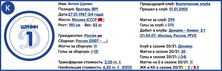 Пост номер один в динамовском коллективе уже достаточно давно прочно зарезервирован за игроком сборной России Антоном Шуниным, играющим за основной состав клуба уже практически 15 лет (а в системе «Динамо» и того больше).