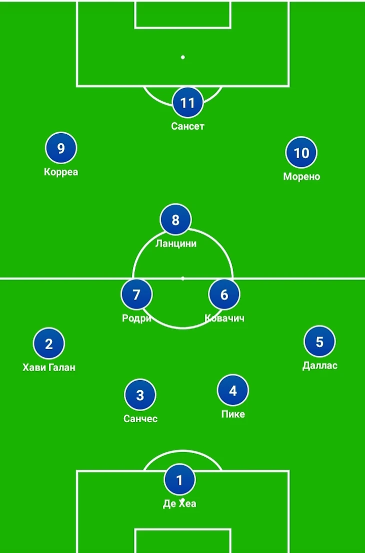 Родри составит пару Ковачичу, ведь провёл отличный победный, хоть и скандальный поединок с "Арсеналом" (2:1): 1 гол на последних минутах, 1 ключевая передача, 2 выигранных единоборства, 2 отбора, 5 выносов и 1 перехват. Центральный полузащитник действительно провёл выдающийся матч, что позволило "Сити" ещё дальше оторваться от своих конкурентов. Теперь уже 10 очков! По потерянным очкам ситуация не особо лучше - отставание на 8. В общем, гонка за чемпионство в Англии становится не очень интересной, а если учитывать отъезд африканских футболистов (в "МС" африканцев нет) и возможный трансфер Влаховича в синий Манчестер, то всё уже понятно.