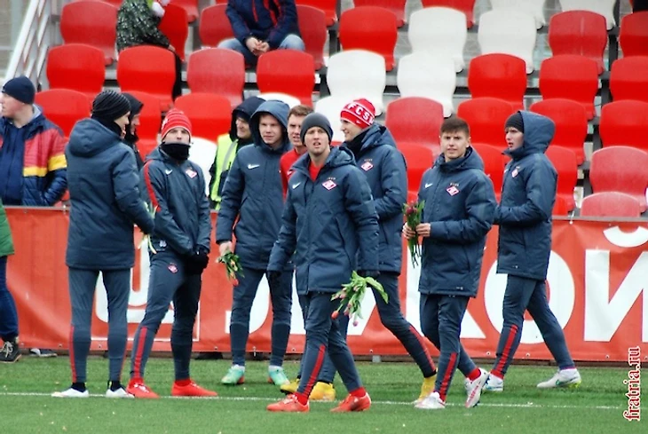 Запасные игроки молодежного состава «Спартака» в перерыве матча против «Краснодара» (0:1) поздравили пришедших на стадион болельщиц с Международным женским днем.