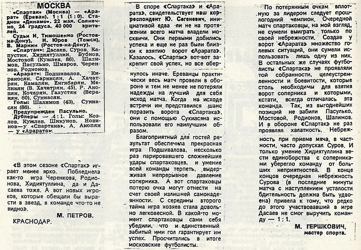 Мне очень понравился матч, когда мы с "Араратом" играли против "Спартака" в Москве на стадионе "Динамо". Матч закончился 1:1, но для меня, скажу так, он был неплохой.