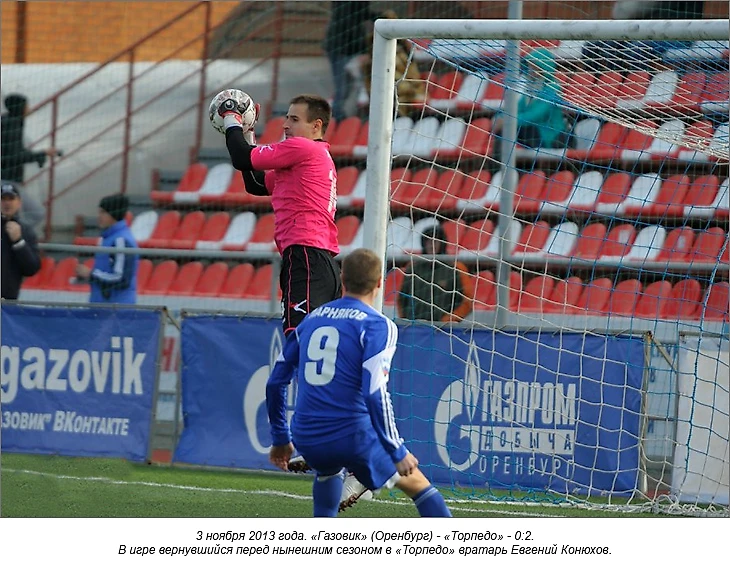 «Газовик» (Оренбург) – «Торпедо» – 0:2 (0:1) 03.11.2013 (воскресенье). Начало – 15:00 (13:00 мск). Оренбург. Стадион «Газовик». +8 градусов. 2500 зрителей (вместимость – 4800). «Торпедо»: Конюхов, Микуцкис, Багаев, Тесак, Айдов (Бояринцев, 46), Кацалапов, Тараканов, Стеклов - к, Кулешов, Власов (Свежов, 90+1), Шевченко. Запасные: Будаков, Князев, Савичев, Салугин, Гаурач. Тренер – А.Г.Бородюк. Голы: 0:1 Шевченко (7), 0:2 Свежов (Стеклов, 90+3).