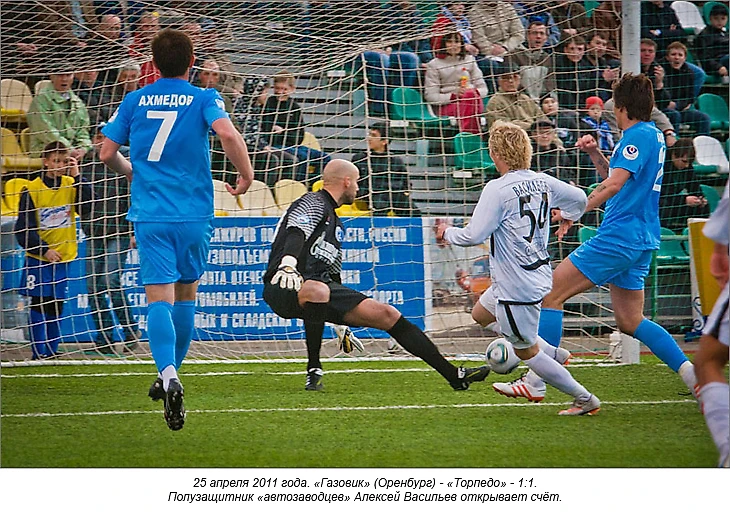 «Газовик» (Оренбург) - «Торпедо» - 1:1 (0:0) 25.04.2011 (понедельник). Начало – 19:30 (17:30 мск). Оренбург. Стадион «Газовик». +10 градусов. 4600 зрителей (вместимость - 4800). «Торпедо»: Клевинскас, Зураев (Мищенко, 61), Чернышов, Малыгин, Хозин, Коновалов - к, Рылов (Безлихотнов, 46), Васильев, Е.Андреев (Положани, 86), Стеклов, Гаврюк (Еркин, 72). Запасные: Рыжиков, Большаков, Намашко. Тренер - И.В.Чугайнов. Голы: 0:1 Васильев (56), 1:1 Парняков (82). Удаление: Васильев (90+2, 2-я жк).