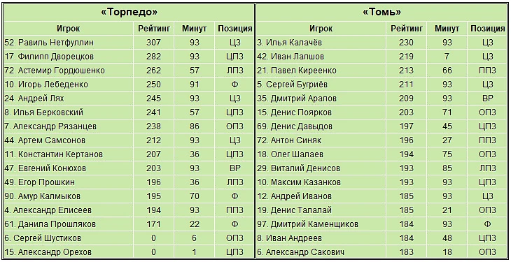 Максимальные индивидуальные показатели игроков «Торпедо» в матче с «Томью»: