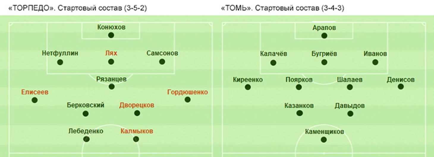 Красным подсвечены футболисты «Торпедо», которых не было в стартовом составе во время предыдущего матча. Перестановки были вызваны тремя дисквалификациями (Андрей Евдокимов → Филипп Дворецков, Андрей Лях → Максим Шоркин, Александр Елисеев → Руслан Магаль) одним тренерским решением (Астемир Гордюшенко → Владислав Адаев) и одним возвращением после дисквалификации (Амур Калмыков → Данила Прошляков). Итого в стартовом составе команды оказалось сразу пять новых игроков.