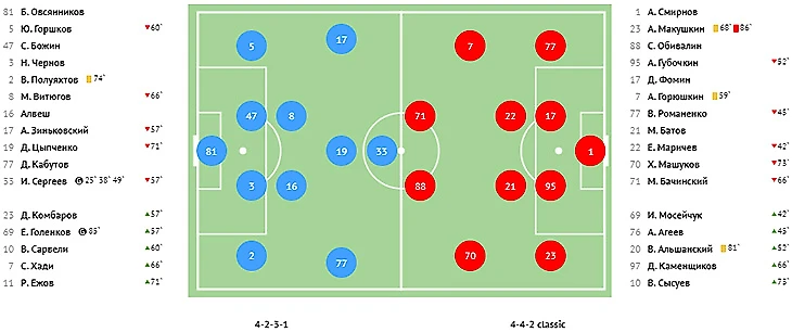 На 38-й минуте Алвеш красиво накрутил нескольких оппонентов у дужки чужой штрафной и вывернув передачу шведой левее себя прямиком на Сергеева. Форвард же точно пробил с разворота метров с 16-ти под дальнюю от себя стойку, поймав вратаря на противоходе.