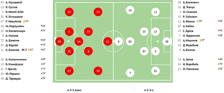 Отличный первый тайм провели футболисты «Спартака-2». Один из лучших для себя за последнее время. Подопечные Евгения Бушманова забили два мяча и вполне могли сделать счёт крупным, но Педро Роша не реализовал пенальти. У команды Сергея Ташуева было много ошибок в обороне, а в атаке проблемы с реализацией.