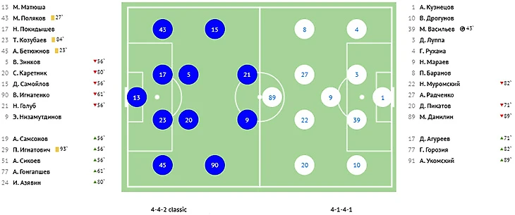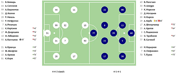 А гол был забит так. Нетфуллин выполнил заброс на левый край штрафной соперника, оттуда передачу в центр выполнил Самсонов, и Калмыков в касание замкнул атаку своего клуба.