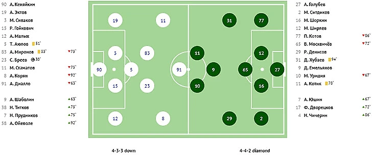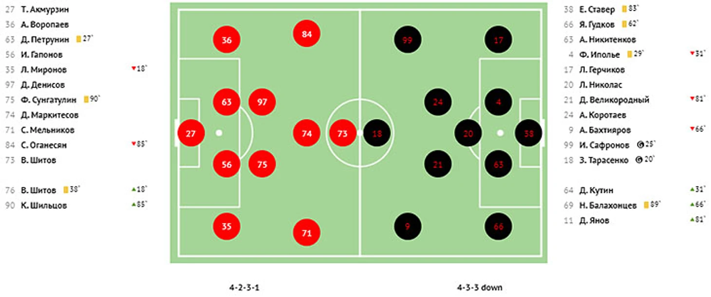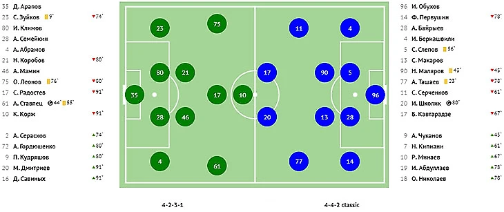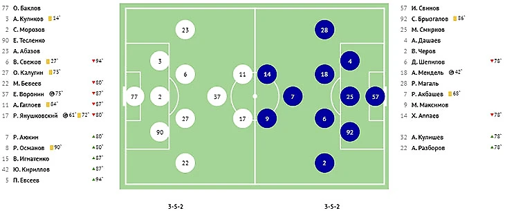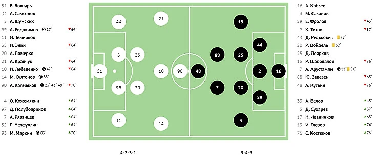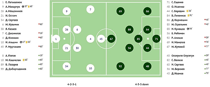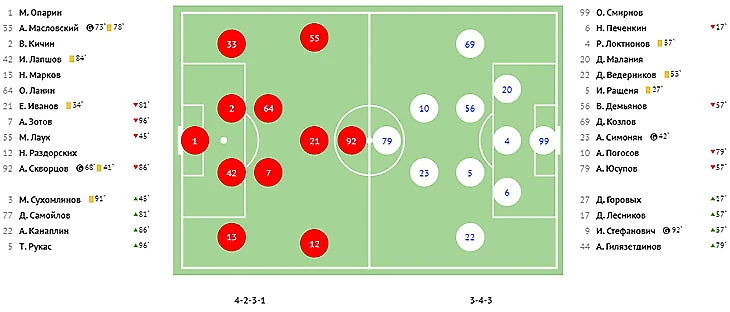 Голы: Арустамян, 10 (0:1). Евдокимов, 17 (1:1). Калмыков, 23 (2:1). Султонов, 35 (3:1). Калмыков, 41 (4:1). Лебеденко, 45 (5:1). Калмыков, 47 (6:1). Маркин - с пенальти, 83 (7:1).