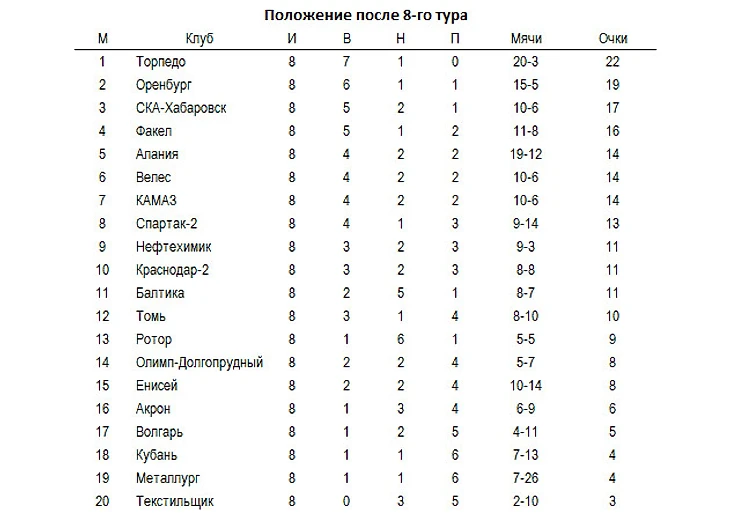 «Торпедо» остановилось в шаге от рекорда, «Оренбург» дышит лидеру в спину, «Факел» оступился. Итоги 8-го тура ФНЛ