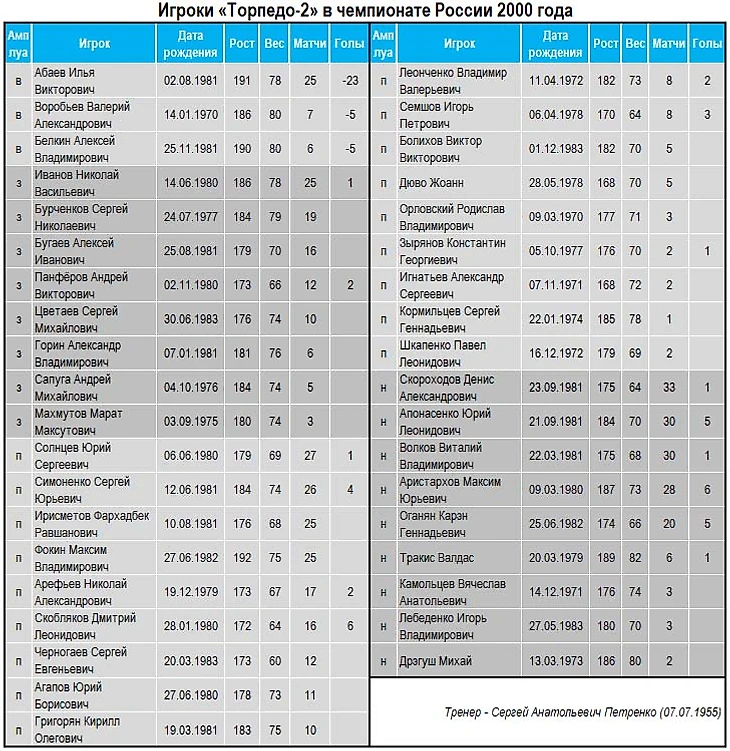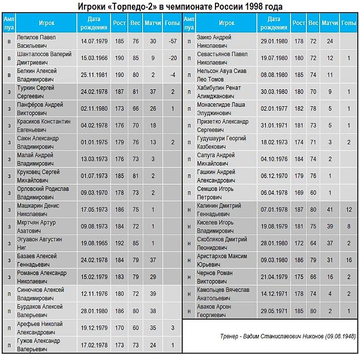 26 января объявлено о том, что ФК «Торпедо» ведет подготовительную работу к подаче документов для лицензирования новой команды клуба в ФНЛ-2. Она получит название «Торпедо-2». Напомним, что у торпедовского клуба уже имелись заявленные официально команды «Торпедо-д» и «Торпедо-2», выступавшие в низших лигах первенства России в качестве самостоятельных команд со сквозной заявкой с основной командой клуба. В этом информационном материале рассказ о том, как это было, каких результатов они добились и кто за них выступал.