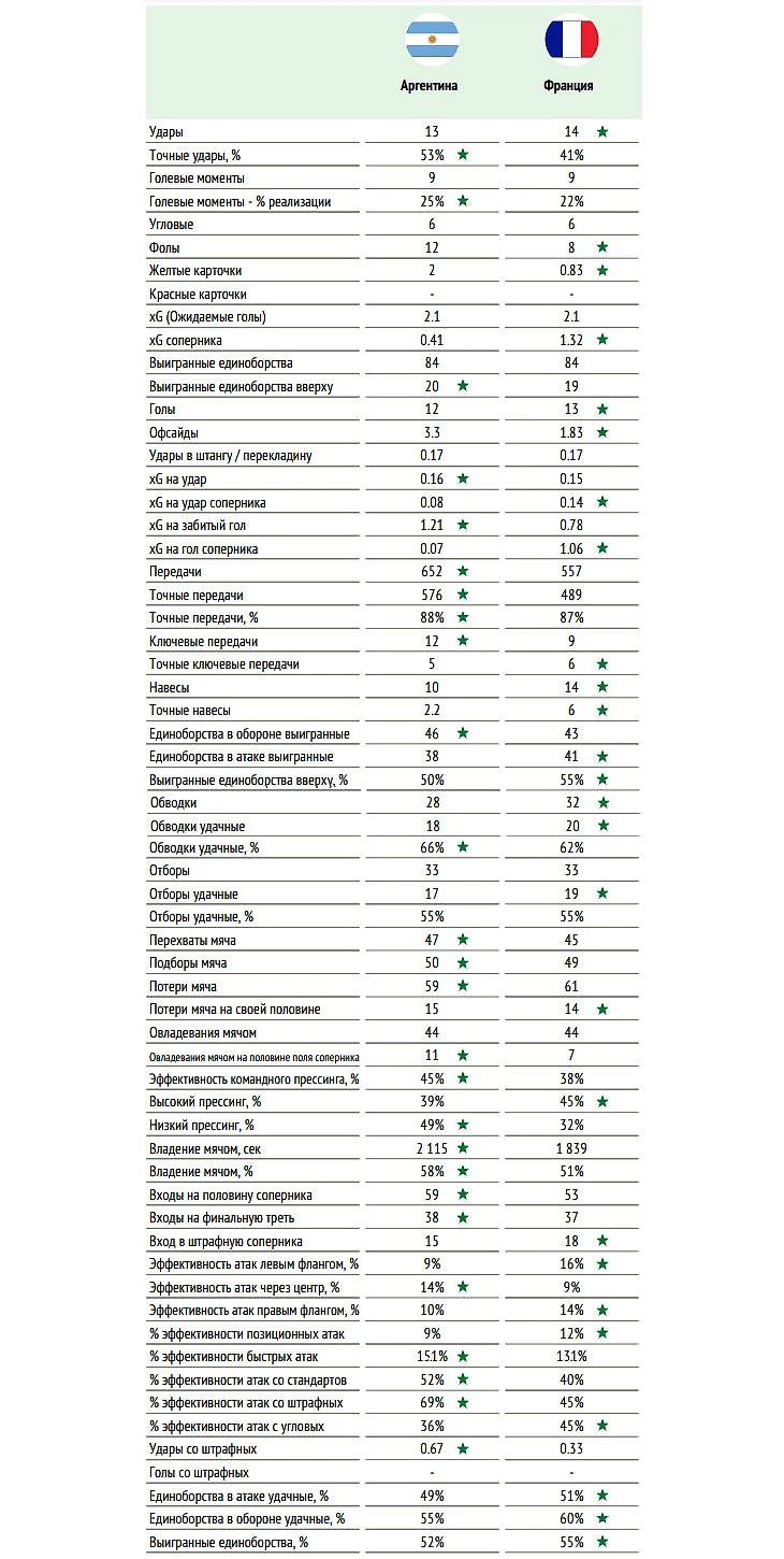 Предлагаем вашему вниманию большую сравнительную таблицу параметров игры финалистов чемпионата мира в Катаре – сборных команд Аргентины и Франции. Выводы о силе соперников делайте самостоятельно.