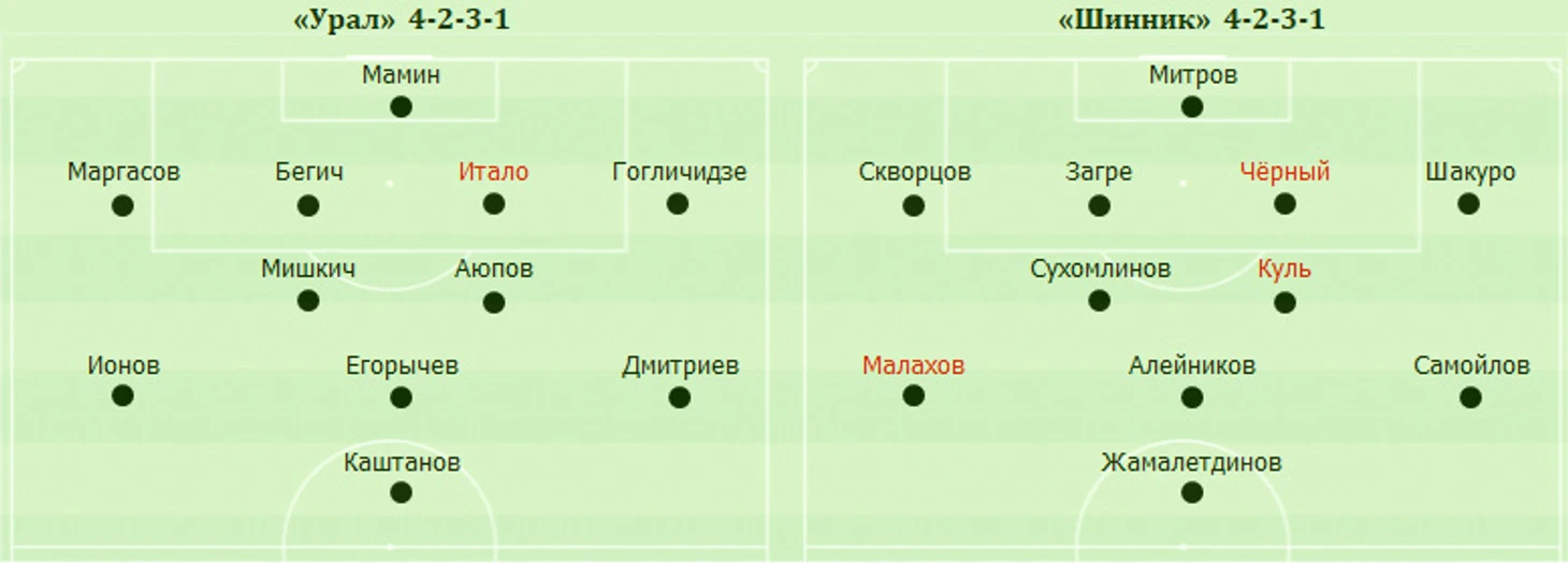 В первом тайме интереснее смотрелся «Урал», но вот с ударами у хозяев были большие проблемы - ни одного в створ. «Шинник» в атаке выглядел не лучше, но ближе к перерыву умудрился заработать пенальти. Жамалетдинов получил мяч на правом краю штрафной, после чего в него врезался сзади Андрей Егорычев, и арбитр Константин Аверьянов указал на «точку». Капитан ярославского клуба Дмитрий Самойлов уверенно пробил в левый от голкипера угол, а тот прыгнул в противоположную сторону.