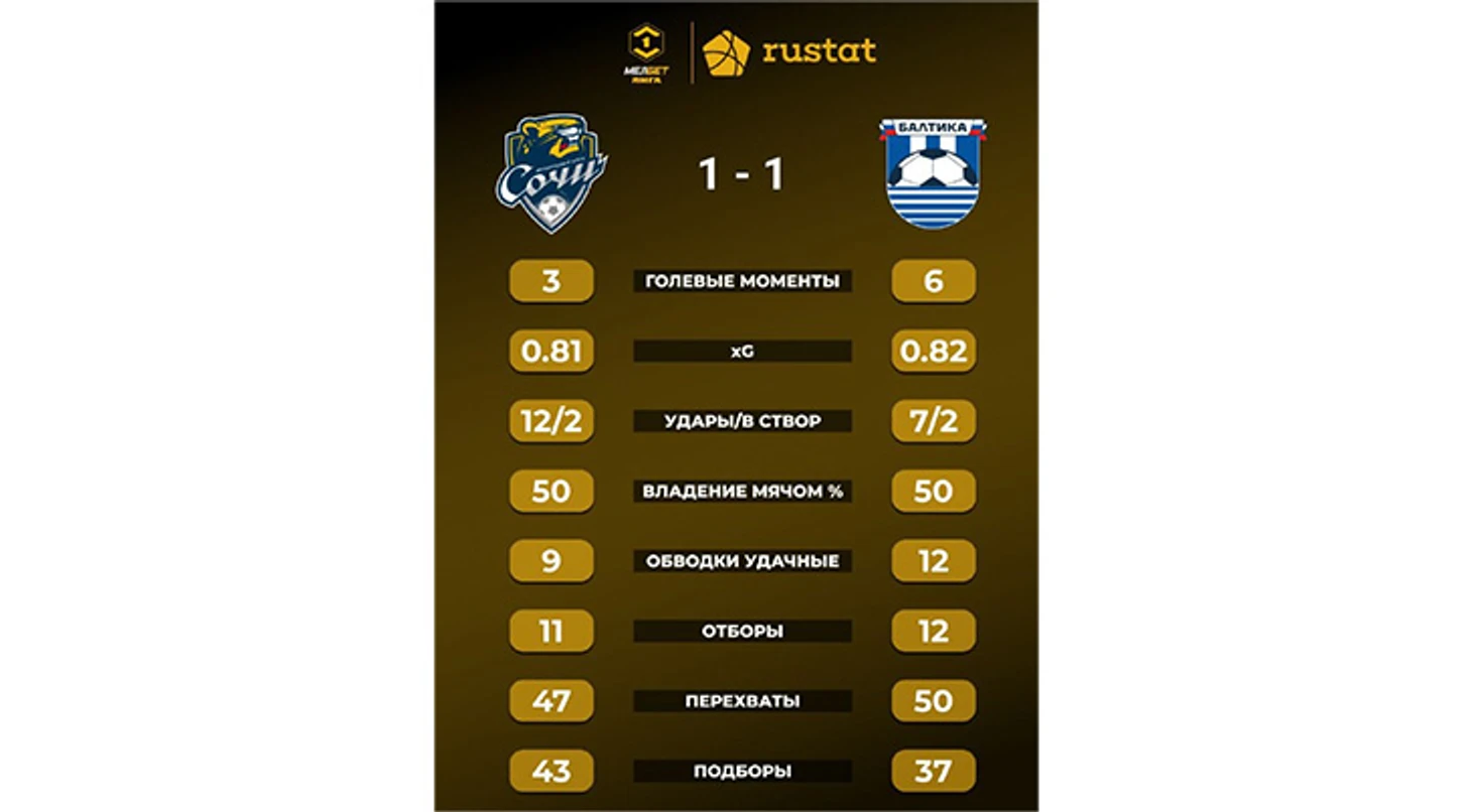 Голы: Барт, 32 (1:0). Маляров, 68 (1:1). «Сочи»: Рудаков, Заика, Литвинов, Марсело Алвес, Макарчук (Сафронов, 77), Кравцов (Левин, 85), Сааведра, Макаров (Магаль, 56), Крамарич (Лазарев, 56), Барт (Федоров, 77), Гуарирапа. «Балтика» (Калининград): Бориско, Луна (Маляров, 46), Гассама, Андраде, Мохаммад (Терентьев, 86), Капленко (Аванесян, 71), Осипов, Саусь (А.Фернандес, 54), Пряхин, Глушков, Стефанович (Никишин, 54). Наказания: Алвес, 12. Гассама, 30. Гуарирапа, 35. Пряхин, 84 (предупреждения). Судья: Абросимов (Санкт-Петербург). 21 июля. Сочи. Стадион «Фишт». 5796 зрителей.