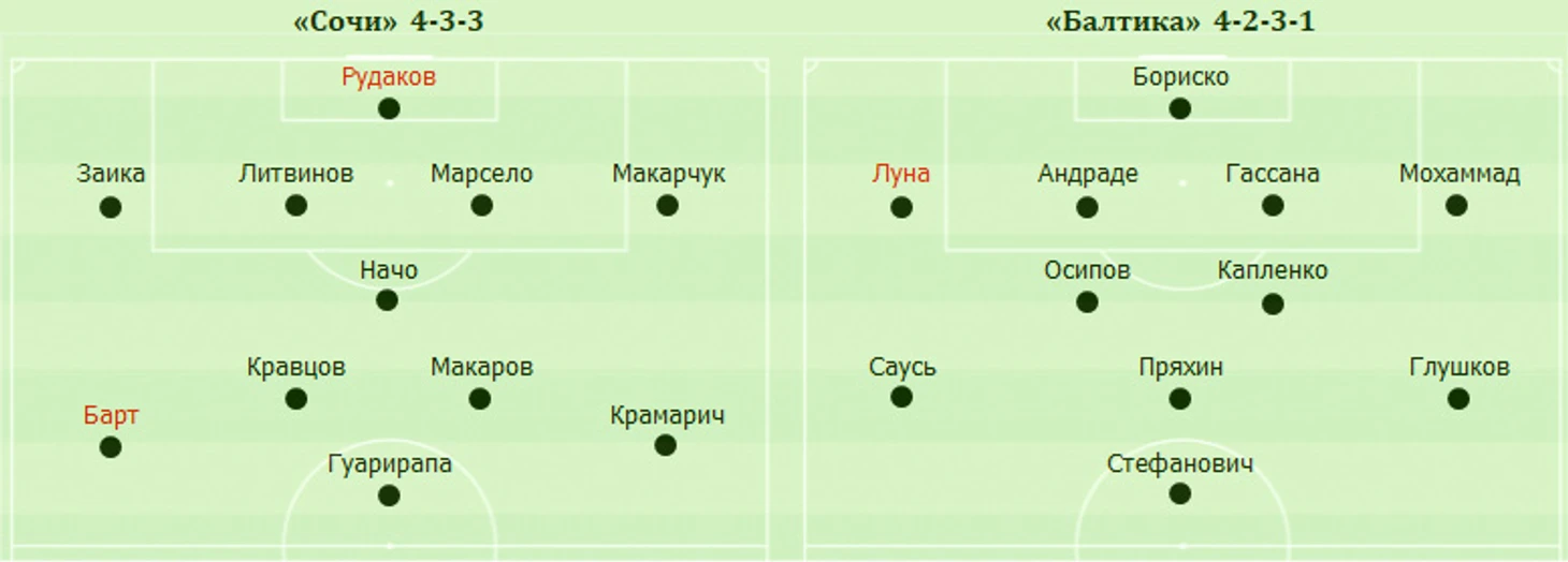 В первом тайме хозяева выглядели поинтересней и побыстрее гостей и заслуженно повели в счёте. На 32-й минуте после розыгрыша аута сочинец Гуарирапа получил мяч в штрафной калининградцев, отпасовал Руслану Барту, и нападающий хозяев вторым касанием метров с восьми расстрелял стража ворот «Балтики» Бориско.