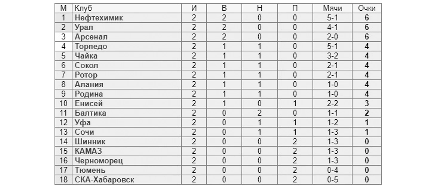 В первенстве Первой лиги состоялись матчи второго тура. По две победы на старте одержали «Нефтехимик», «Урал» и тульский «Арсенал». Это трио лидирует в таблице.