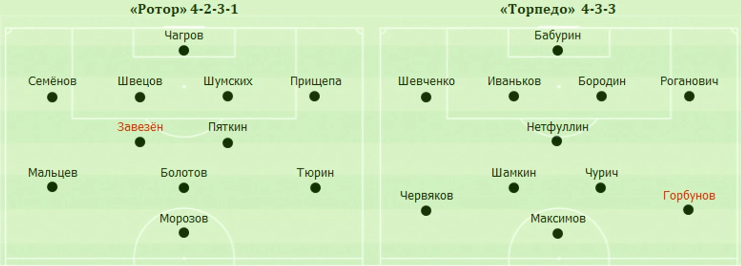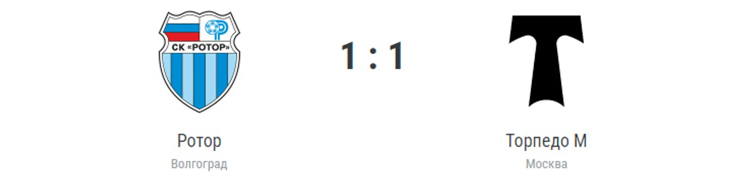 Голы: Горбунов, 17 (0:1). Болотов, 66 (1:1). «Ротор» (Волгоград): Чагров, Семенов, Швецов, Шумских, Прищепа, Пяткин (Соколов, 63), Мальцев, Завезен (Плотников, 46. Шильников, 77), Болотов (Усанов, 74), Тюрин, Морозов (Агеев, 63). «Торпедо» (Москва): Бабурин, Шевченко, Иваньков (Данилкин, 88), Бородин, Роганович, Нетфуллин, Червяков (Манелов, 70), Чурич (Апонса, 65), Шамкин, Горбунов (Костин, 70), Максимов (Корян, 65). Наказания: Завезен, 45+1. Шевченко, 66 (предупреждения). Судья: Зияков (Набережные Челны). 22 июля. Волгоград. Стадион «Волгоград Арена». 19 109 зрителей.