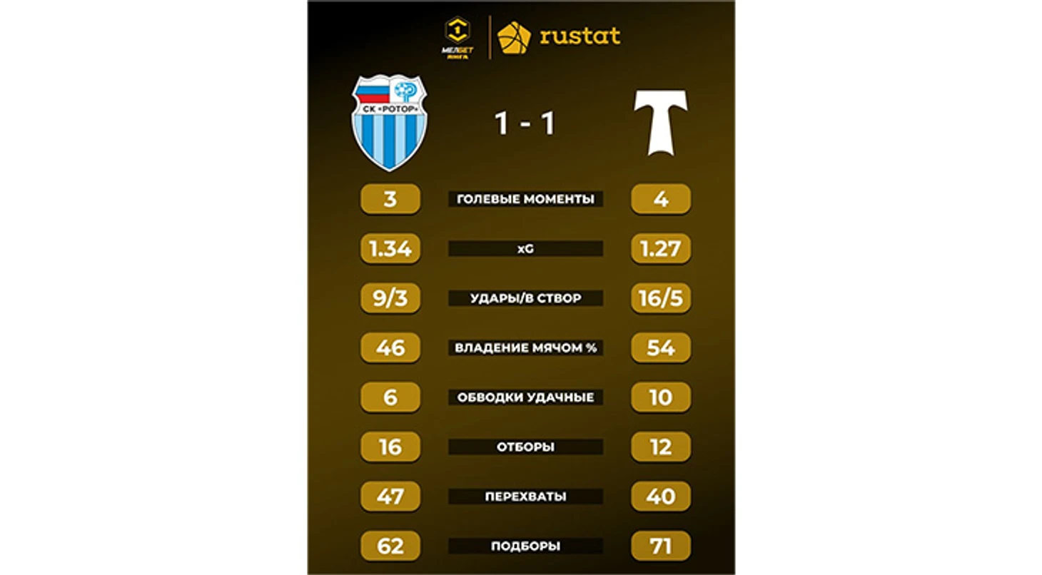 ● Беспроигрышная серия «Торпедо» в Волгограде выросла до шести матчей. ● Беспроигрышная серия «Торпедо» в матчах с «Ротором» без учёта фактора поля выросла до десяти игр. ● «Торпедо» с учётом предыдущего сезона Первой лиги не пропускает в первых таймах 11 матчей подряд. ● «Торпедо» - единоличный лидер стартовавшего сезона по количеству очков, набранных в первых таймах - шесть из шести возможных. ● «Торпедо» - единоличный лидер Первой лиги по показателю «голы вышедших на замену»: в составе команды Олега Кононова отличились уже два футболиста, поднявшиеся со скамейки запасных.