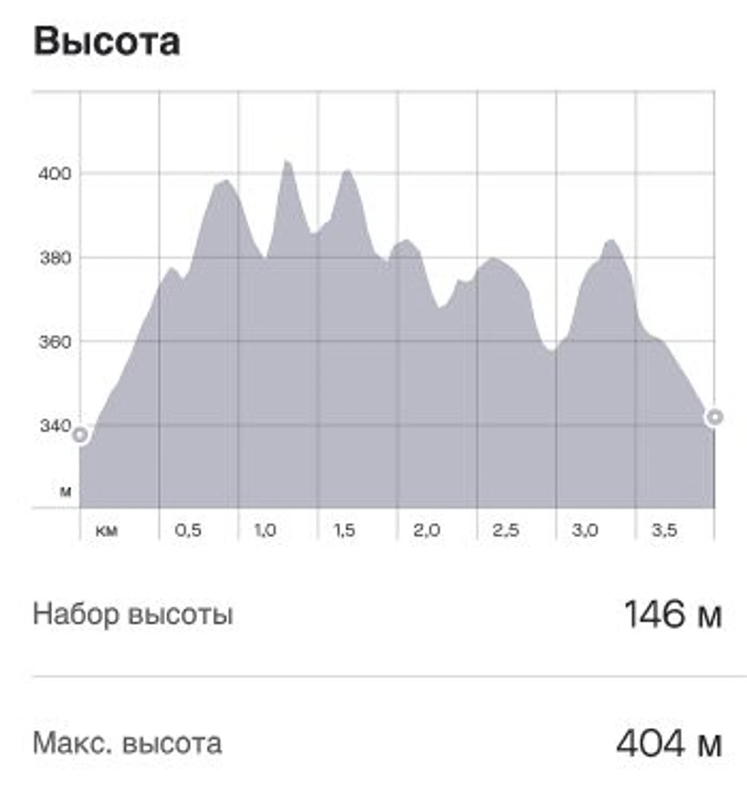 В остальном трасса очень простая, суммарный набор высоты получился всего 146 метров. Старт на высоте ~340 метров над уровнем моря, самая высокая точка на трассе – примерно 404 метра над уровнем моря.