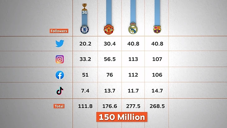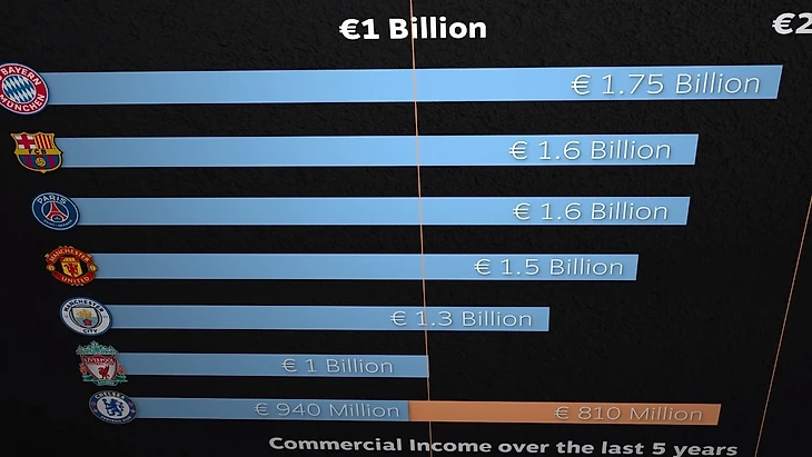 Коммерческие доходы (спонсорские) Челси резко выросли при Абрамовиче, но они по-прежнему не могут заключать крупные коммерческие сделки, которыми пользуются их соперники. Этот разрыв в коммерческой привлекательности связан с тем, что такие клубы, как Реал Мадрид, Манчестер Юнайтед Юнайтед и Барселона создавали свои бренды на протяжении нескольких десятилетий непрерывного успеха. Челси — относительные новички, и им потребуется больше времени и трофеев, чтобы наверстать упущенное. Этот разрыв в глобальной привлекательности можно измерить с помощью социальных сетей: Челси отстает от своих соперников более чем на 150 миллионов подписчиков.