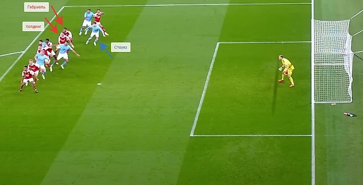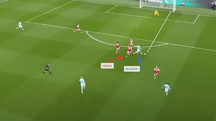 Первый мяч футболисты «Сити» забили, благодаря связки Стоунз - Холанд - Де Брейне, где первый длинным выносом ушел от прессинга, Холанд выиграл борьбу с Холдингом в центре поля и сразу же выдал идеальный пас на бельгийца. Де Брейне пробежал с мячом половину поля, не получив сопротивления и спокойно, как в бильярде положил мяч в ближний угол ворот Арсенала. Так легко и обыденно, и так гениально. Холдинг мог помешать Кевину пробить, но он решил просто пробежаться рядом и посмотреть футбол.