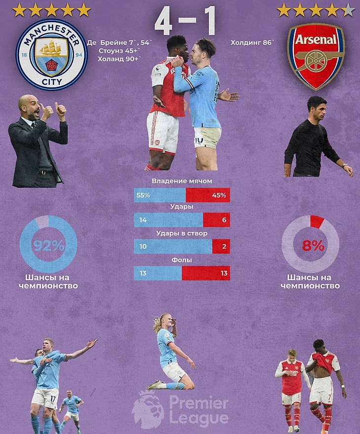 У «канониров» что-то сломалось под конец сезона. Их скоростной болид был смят катком из Манчестера вчера, и непонятно, сможет ли дальше Арсенал собрать все свои силы и выложиться на максимум в оставшихся матчах. Расклады таковы, что каждый следующий матч для «пушкарей» - это финал, в котором нужно побеждать и побеждать крупно, и желательно, вообще не пропускать. У «горожан» же в запасе есть два матча, но и расслабляться им не стоит. Всего одно поражение может вернуть гонку в чемпионате, а значит, Сити должны тоже выложиться по максимуму, а у них еще две игры с Мадридским Реалом. И такой Манчестер Сити может стать непроходимой преградой даже для такого клуба как Реал. В любом случае, будет интересно смотреть за концовкой сезона.