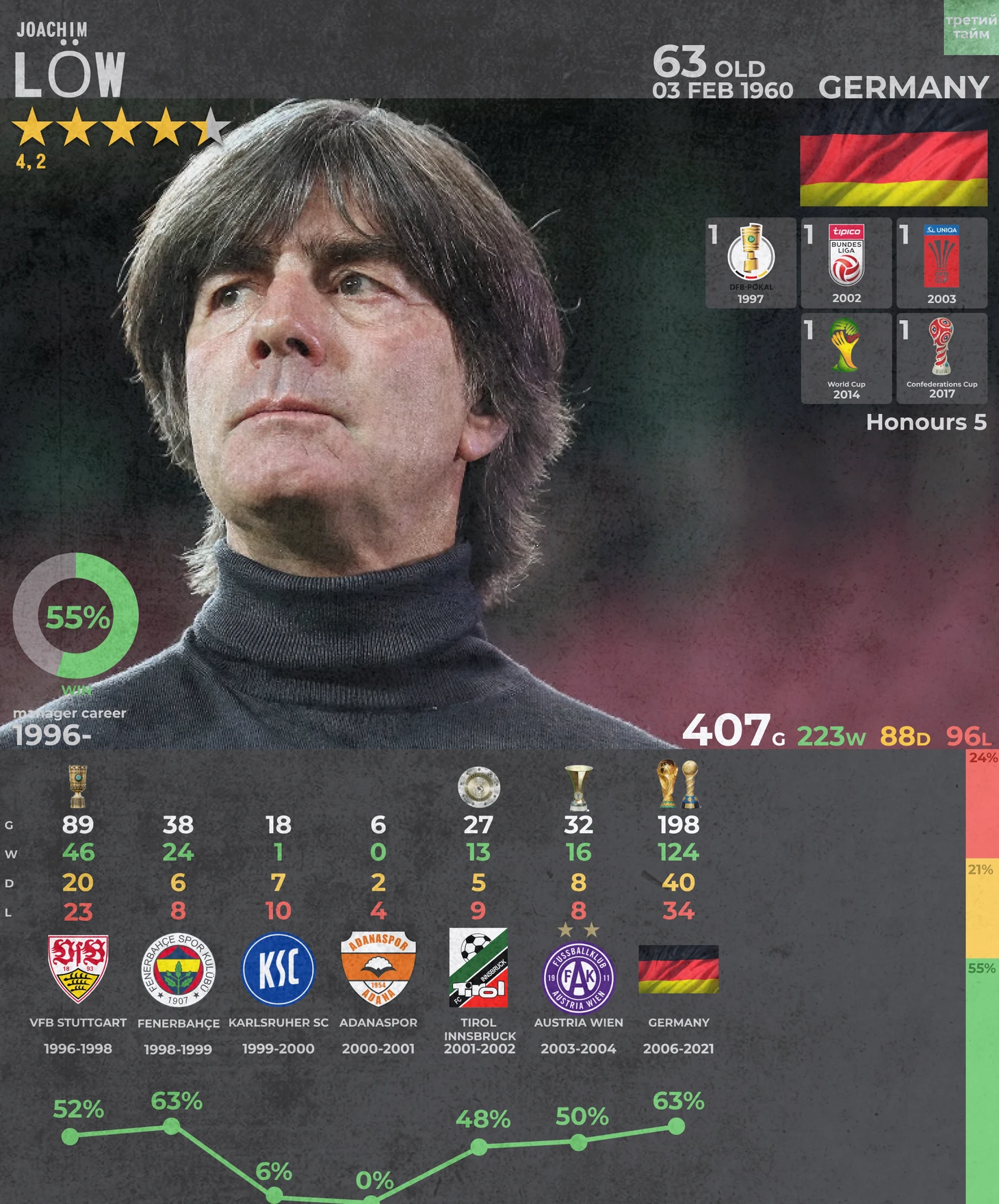 Человек, который посвятил большую часть своей тренерской деятельности сборной Германии. Кажется, что он был там всегда, настолько привыкли мы его видеть у бровки на матчах Германии. Но Лёв начинал свою тренерскую карьеру еще в далеком 1996 году в Штутгарте, с которым взял кубок Германии, но выбор дальнейших клубов у Лёва был весьма своеобразен: Фенербахче, Карлсруэ, Аданспор, где тренер не добился успехов. После ряда неудач немец отправился в Австрию, где возглавил Тироль, выиграв местный чемпионат. Последним клубом для Лёва стал Аустрия Вена. В 2004 году немецкий специалист ушел из клуба ради карьеры помощника главного тренера в сборной Германии, которую возглавлял Клинсман. Через два года уже самому Йоахиму предложили пост главного тренера. Здесь и началась его успешная карьера. Сборная Германии под руководством Лёва долгое время на каждом крупном турнире добивалась успехов. Евро 2008 – 2 место, Чемпионат Мира 2010 – 3 место, Евро 2012 – 3 место. Каждый раз Сборной не хватало совсем немного для последнего шага, и вот на Чемпионате Мира в Бразилии в 2014 году сборная Германии наконец-то взяла свой трофей, выиграв в финале Аргенитну 1-0, но больше всего на том чемпионате, конечно же, запомнился матч против Бразильцев в 1/2 финала, где немцы обыграли сильнейшую сборную Бразилии 7-1. Для Лёва тот чемпионат стал пиком карьеры в сборной. После успеха в 2014 году в сборной началась мягкая перестройка и смена поколений, и сборная Германии увязла в постоянных проблемах. Третье место на Евро 2016 еще было приемлемым результатом, но дальнейшие неудачи сборной на ЧМ 2018 в России, где немцы заняли последнее место в группе и вылет в 1/8 финала на Евро 2020 от Англии вынудили Йоахима Лёва подать в отставку с поста главного тренера. С 2021 года немецкий специалист отдыхает, но, кажется, не собирается уходить на пенсию. Еще в октябре Лёв заявил о желании вернуться к тренерской деятельности, после чего пошли слухи, что он может вновь возглавить Штутгарт. После в прессе появлялись слухи о возможном назначении немецкого специалиста в Реал Мадрид в случае ухода Карла Анчелотти. Есть также вариант со сборной Бразилии. Кажется, чтобы разгадать этот клубок нужно время, но, вероятно разговоры о Реал Мадриде, сборной Бразилии, Карле Анчелотти и Лёве имеют под собой определённую почву для размышлений. Вполне вероятно, что летом мы увидим переход Анчелотти на пост «главного» в сборную Бразилии, а Лёв переедет в Мадрид. Но Йоахим так давно не тренировал на клубном уровне, что ему, возможно, будет очень непросто, особенно в таком клубе, как Реал, поэтому самым вероятным вариантом остается сборная Бразилии. Вполне возможно, что тренер не будет торопиться переезжать в далекую Бразилию и подождет предложений от Европейских сборных. Например, сборная Норвегии, которая тормозит в начале отборочного пути уступив Испании и сыграв в ничью с Грузией. Холанда и компанию пора кому-то спасать, и было бы интересно посмотреть на Лёва в этой прогрессирующей сборной. Мой прогноз – Европейская сборная (Норвегия).