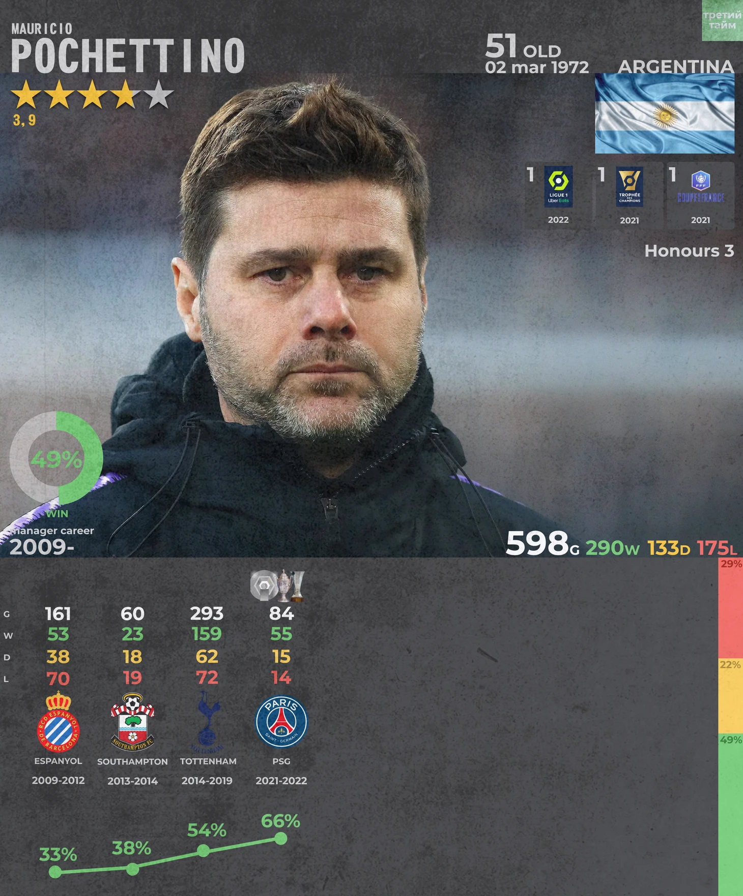 Еще один, довольно таки молодой тренер, который остался без работы в 2022 году после отставки из ПСЖ. Для руководства парижского клуба уже недостаточно победы в Чемпионате, чтобы сохранить тренера. А начиналось для Маурисио все с Испанского Эспаньола, который он возглавил в 2009 году и спас команду от вылета по ходу сезона. В следующие сезоны Эспаньол занимал стабильные места в середине таблицы, а молодой тренер оттачивал свое мастерство. В 2013 году Почеттино был приглашен в Саунтгемптон, где отработал всего один сезон, но добился хороших результатов, заняв с клубом 9 место в АПЛ. На следующий год аргентинский тренер подписал контракт на 5 лет с Тоттенхэмом. Аргентинец не смог добыть для «шпор» долгожданных трофеев, но поставил отличную игру, вырастил прекрасных игроков и выходил с не самым сильным составом в финал Лиги Чемпионов, где его команда уступила Ливерпулю, при этом сам тренер очень сильно вырос за годы, проведенные в Лондоне. Также в актив Почеттино можно занести второе место в сезоне 2016-2017 с 86 очками. Но после ряда неудач в чемпионате в сезоне 2019-2020 руководство клуба отправило аргентинца в досрочный отпуск, всего после нескольких месяцев с финала Лиги Чемпионов. Последним местом работы был ПСЖ, где специалист наконец-то смог взять свои первые трофеи в качестве главного тренера. Но после неудач в Лиге Чемпионов все же был отправлен в отставку. Если верить прессе, то вопрос продолжения карьеры для Почеттино сейчас уже решен. Переговоры с Челси проходили в позитивном ключе, и специалист может приступить к работе уже этим летом. Осталось дождаться официальных заявлений от представителей клуба и самого Маурисио. Прогноз делать не будем, потому что и так все понятно.
