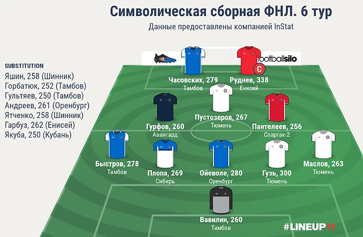Лучшим клубом 6 тура ФНЛ во второй раз кряду стал "Тамбов" со средним общекомандным рейтингом InStat Index, равным 239 баллам. Худшей же командой оказалась "Луч-Энергия", набравшая лишь 173 балла.