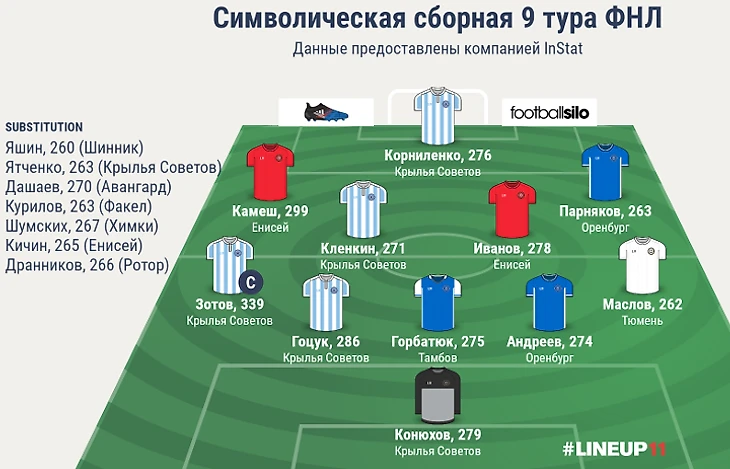 Лучшим клубом 9 тура ФНЛ стали "Крылья Советов" со средним общекомандным рейтингом InStat Index, равным 259 баллам. Худшей же командой оказалась "Томь", набравший лишь 174 балла.
