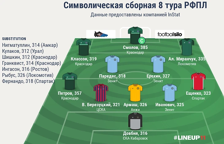 Лучшим клубом 8 тура РФПЛ стал "Краснодар" со средним общекомандным рейтингом InStat Index, равным 294 баллам. Худшей же командой, несмотря на гениальную игру Александра Довбни, снова оказался "СКА-Хабаровск", набравший лишь 225 балла.