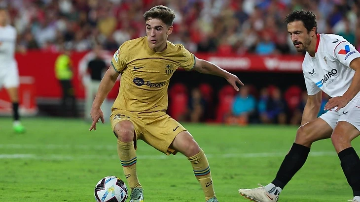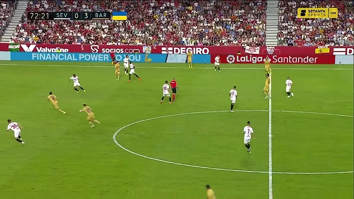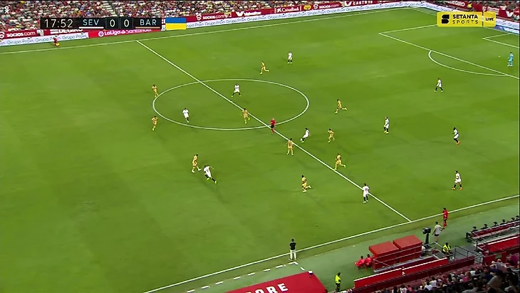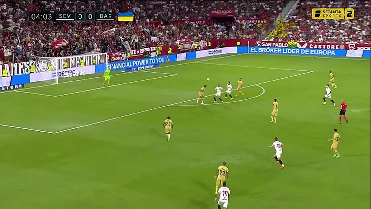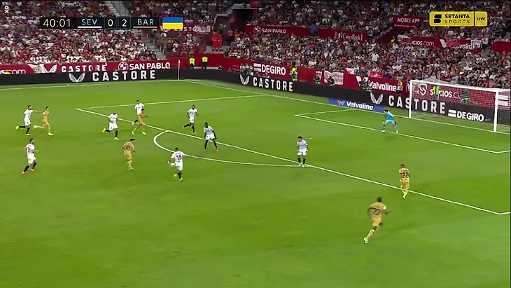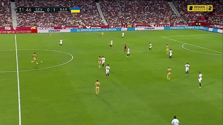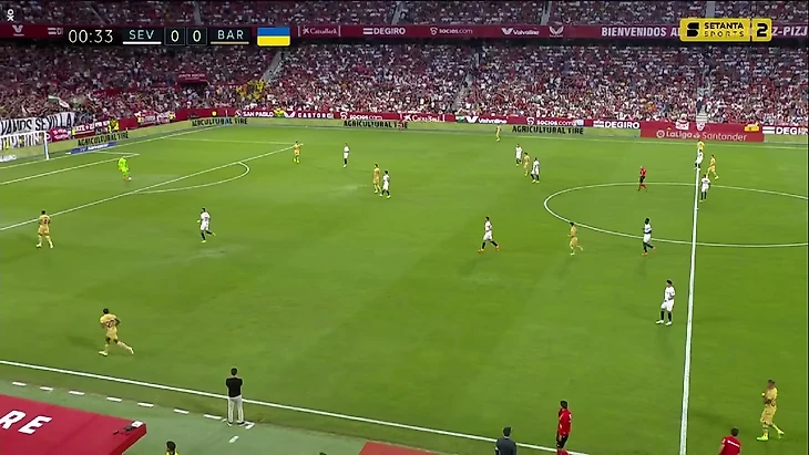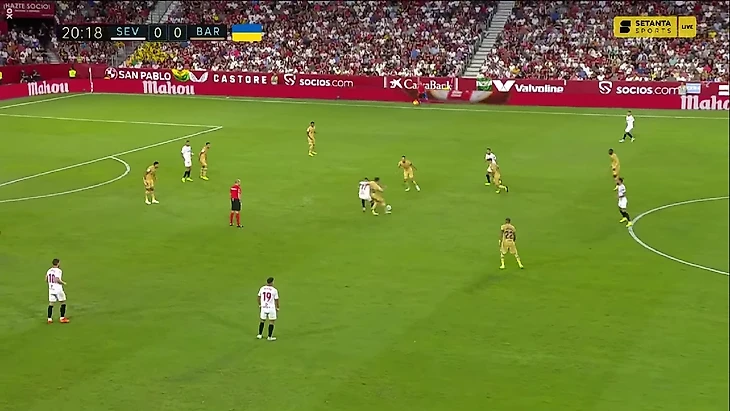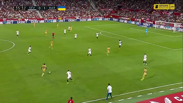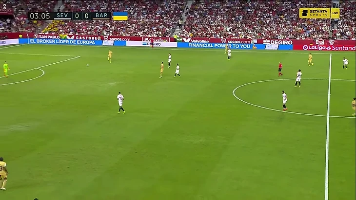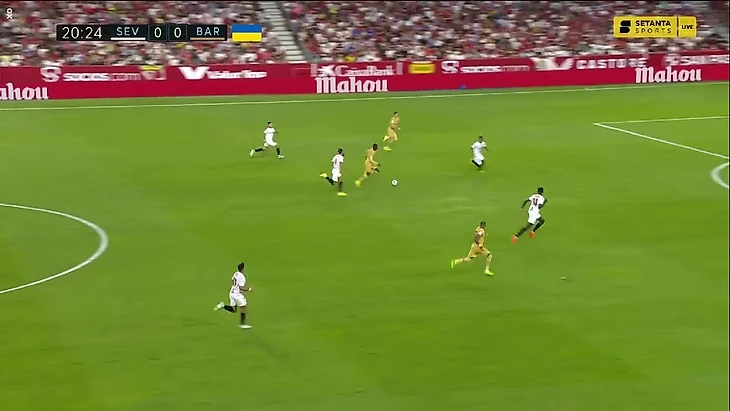 Собственно, первый гол пришёл из быстрой атаки – «Севилья» сначала перехватила мяч, попыталась его разыграть, но Эрик Ламела замешкался с мячом, Гави этим воспользовался, отобрал мяч и тут же отдал передачу на ход Усману Дембеле.
