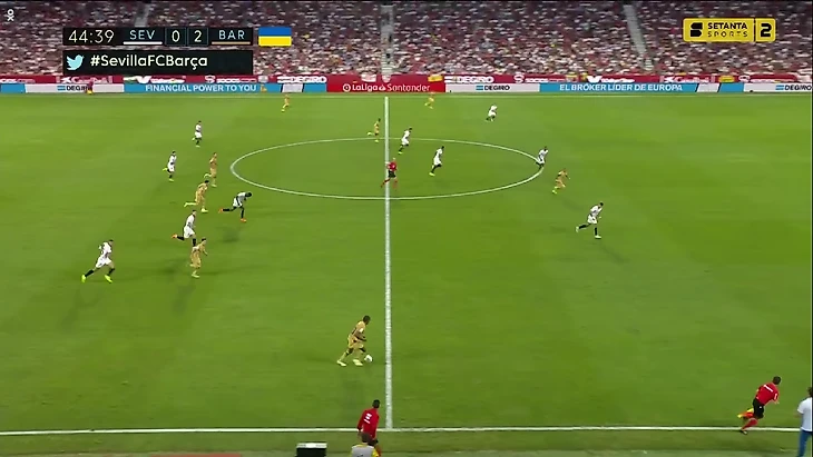 Однако совершенно нельзя сказать, что план Лопетеги был лишён недостатков. Агрессивный, местами персональный прессинг с высокой линией обороны уязвим к быстрым атакам, а так же зависим от умения вести борьбу для отдельных игроков (сдержать наверху того же Левандовского – не самая простая задача). Да, в первые 20 минут «Севилье» это принесло больше плюсов, чем минусов. Благодаря эффекту неожиданности и уязвимости каталонцев к прессингу и в переходных стадиях, «Севилья» смотрелась опаснее «Барселоны» и могла легко претендовать на первый гол. Но как только каталонцы оказывались на чужой половине поля, это тут же приводило к весьма перспективным атакам.