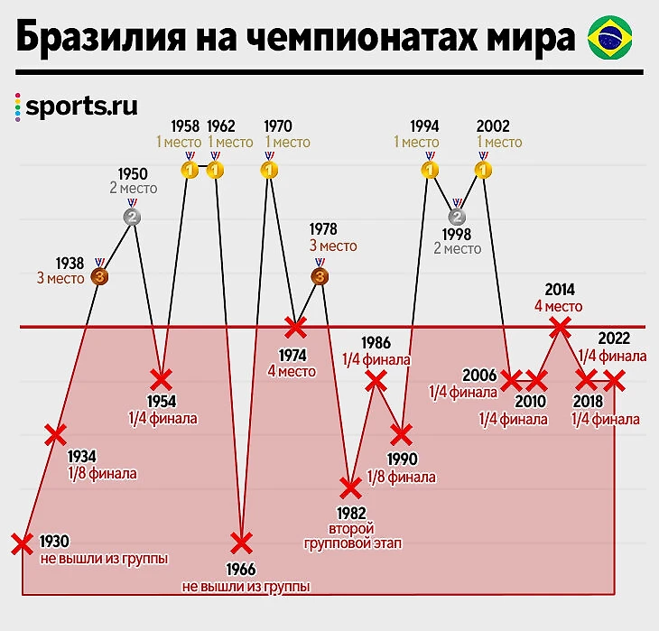 На графике видно, что предыдущий неудачный период пришелся на 80-е. Тогда сборная Зико и Сократеса два раза оставалась без медалей – в 1982-м не прошли второй групповой этап (по сути тот же четвертьфинал), в 1986-м вылетели от Франции в дополнительное время.