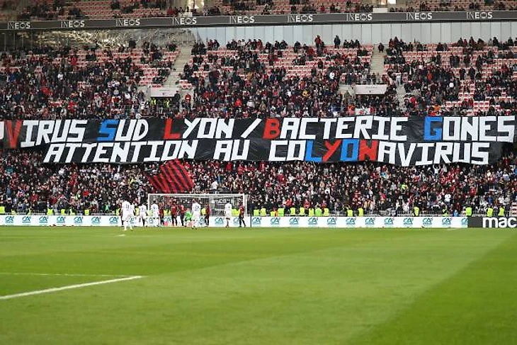 Точно также поступили и ультрас "Ниццы", которые на домашней игре с врагами из "Лиона" презентовали большой баннер "Virus Sud Lyon/Bacterie Gones. Attention au coLYONavirus", в котором упомянули фанатскую южную трибуну "Virage Sud" (обыграли созвучие слов "Вираж" и "Вирус") стадиона "Лиона", фанатскую группировку гостей "Bad Gones" (заменили "Bad" на "Бактерию", что довольно забавно, учитывая словосочетание "Bad Bacteria" из медицины – "Плохая бактерия"), ну а последней фразой призывали всех опасаться "коЛИОНавируса" – даже тут обыграли название коронавируса с именем гостевого клуба. Естественно некоторые элементы баннера были выполнены в красно-синих цветах "Лиона".