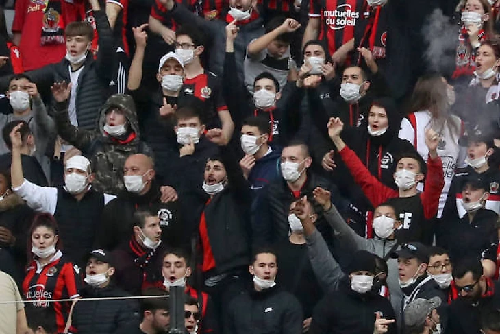 При этом фанатье "Ниццы" на своей заворотке были облачены в защитные маски, но пугал их не тот вирус, который стремительно разлетается по всему миру, а именно "коЛИОНавирус", который так боялись подцепить фанаты "Ниццы".
