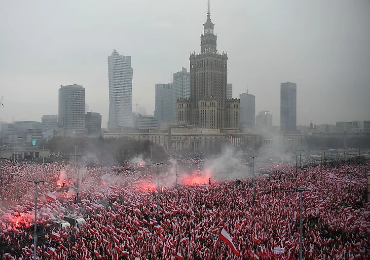 Небольшая справка: Марш Независимости отмечается каждый год 11 ноября и посвящён обретению независимости в 1918 году. Этот день является общегосударственным выходным и сопровождается поднятием флагов, выступлением президента страны, военным парадом в центре Варшавы, а также многотысячными шествиями (в 2016 году, например, в марше приняло участие более 100 тысяч человек!) простых граждан, хардкор которых составляют футбольные фанаты, которые съезжаются в Варшаву со всей Польши. Зачастую эти марши заканчиваются локальными беспорядками и погромами, а также столкновениями с полицией.