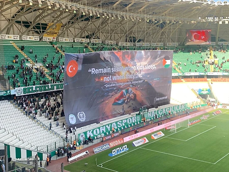 В целом в Турции Палестина в этом вопросе пользуется однозначной поддержкой — вот, к примеру, перфоманс фанатов «Коньяспора» на игре против «Пендикспора» с призывом говорить в полный голос о трагедии в секторе Газа: «Молчать, когда дети спят, а не тогда, когда они умирают».
