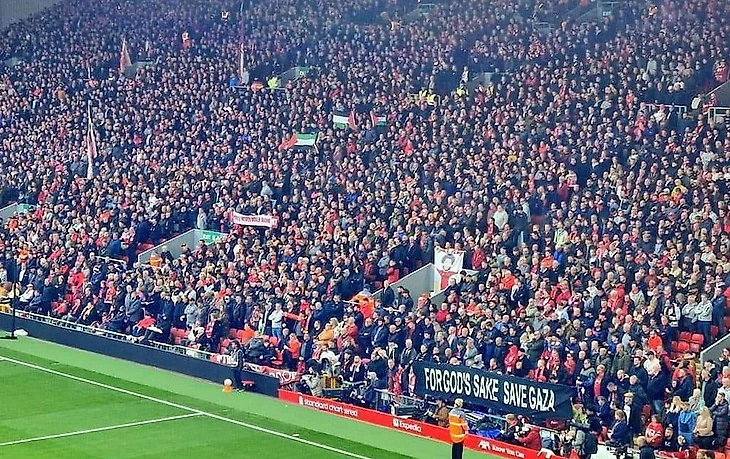 На дерби «Ливерпуль»-«Эвертон» фанаты «красных» вывесили баннер «Ради Бога, спасите сектор Газа» и несколько палестинских флагов на фоне. Такая акция со стороны англичан могла вызывать недоумение, тем более за несколько дней до этого английские националисты напали на мигрантов, которые вышли на митинг в поддержку «ХАМАС» в Лондоне. Но всё станет понятным, если приглядеться на фото ещё раз — совсем недалеко от этого баннера висит небольшое полотно с изображением Салаха, поэтому очевидно, что данный призыв — дело рук египетских болельщиков, тем более что Египет для Палестины сегодня является ближайшим соратником и географическим соседом (хотя до израильской оккупации сектор Газа был под оккупацией египетской). Сам Салах подвергся огромной критике со стороны своей мусульманской аудитории за долгое молчание, после чего, наконец, записал видеообращение, в котором призвал положить конец насилию в секторе Газа, а также обеспечить его жителей едой, водой и медикаментами.