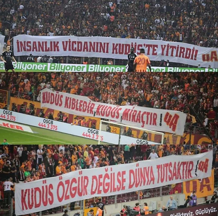 А вот фэны «Галатасарая» были куда категоричнее: «Если Иерусалим не будет освобожден, весь мир останется в плену», «Иерусалим — это Кибла, Иерусалим — это вознесение», «Человечество потеряло свою совесть в Иерусалиме» — такой посыл несли в себе фанатские баннеры от объединения «UltrAslan». Кибла — это направление в сторону Каабы (а Кааба — мусульманская святыня в виде кубической постройки во внутреннем дворе мечети аль-Харам в Заповедной мечети в Мекке. В исламе Кааба почитается как священное место), используемое мусульманами в различных религиозных ритуалах, особенно при совершении намаза. Ну а Иерусалим, по мнению турок, должен быть освобожден от евреев.