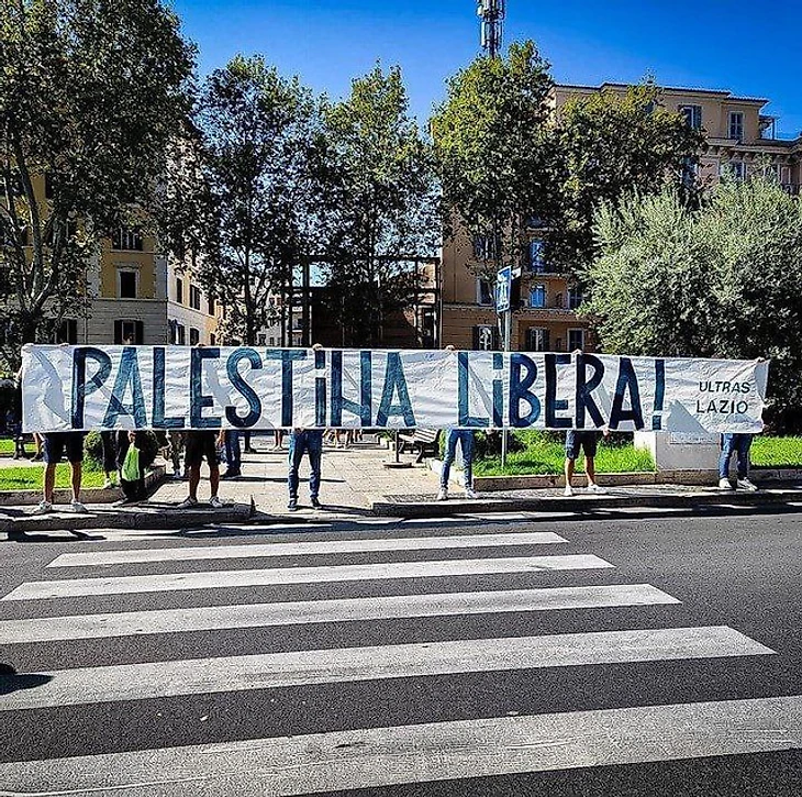 На первый взгляд удивили и ультрас «Лацио», которые, в отличие от фанатов «Селтика», придерживаются крайне правых и фашистских взглядов – о конфликте с политическим окрасом между фанатами этих двух команд я рассказывал буквально на днях в обзоре трибун Лиги Чемпионов. Так вот, ультрас «Лацио» перед домашней игрой против «Аталанты» развернули баннер «Свободная Палестина. Ультрас Лацио», чем всполошили футбольную общественность.