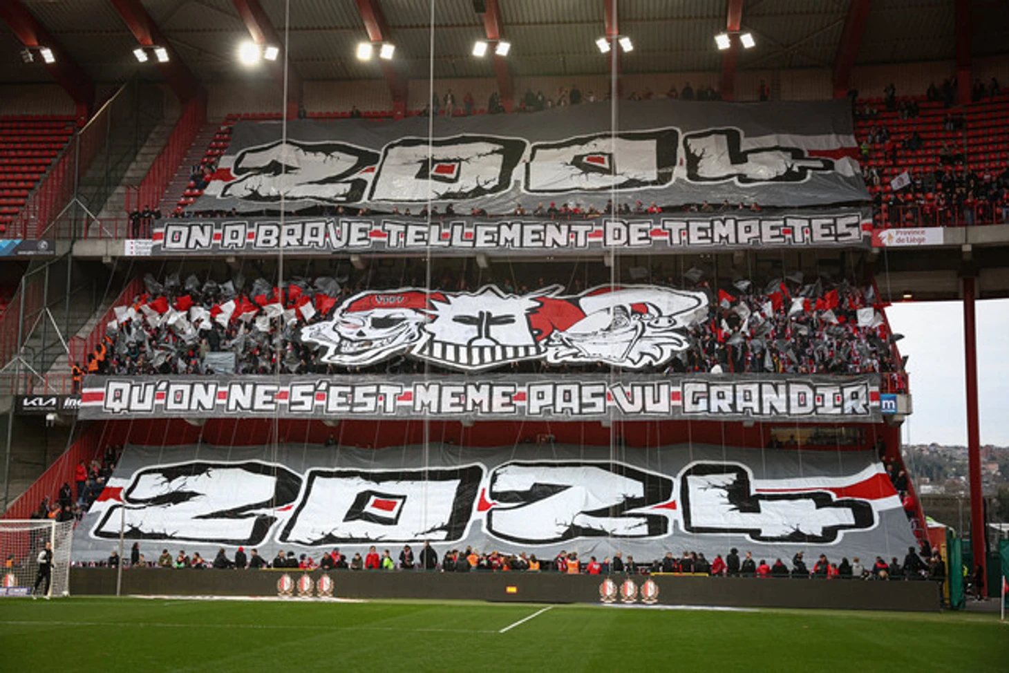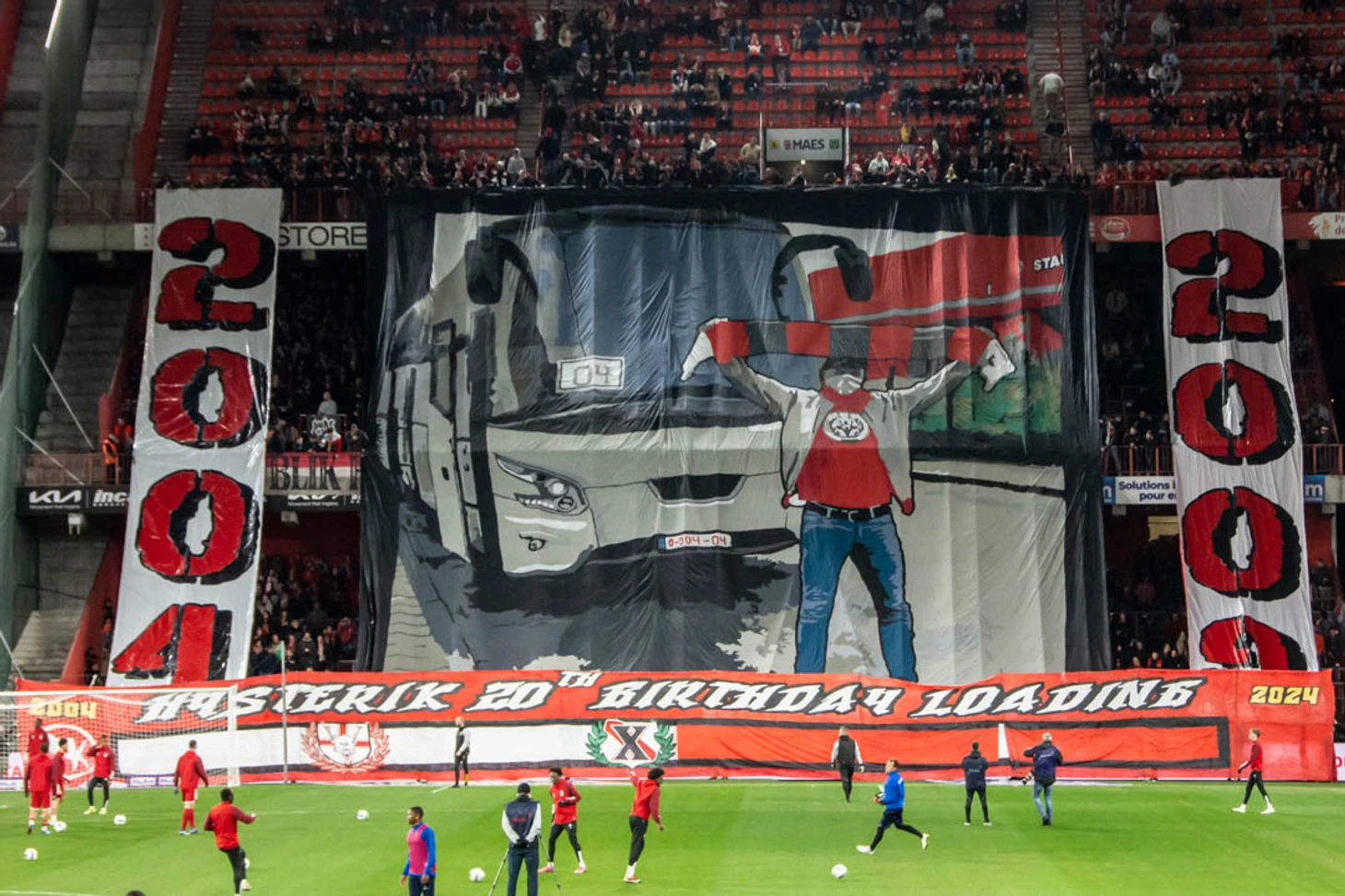 Следующим баннером стало изображение фаната с шарфом в руках на фоне автобуса с номером 04 – такой у Льежа телефонный код. Позади видна арена, на которой выступают «красные» – это стадион «Морис Дюфран». Временной отрезок происходящего на баннере – с 2004-го по 2009 год.