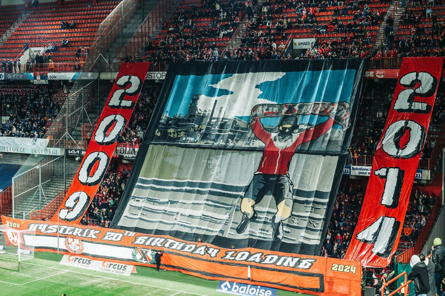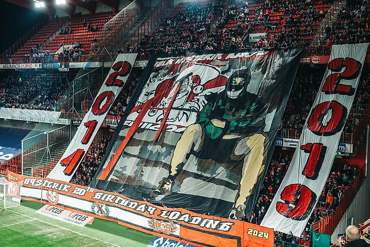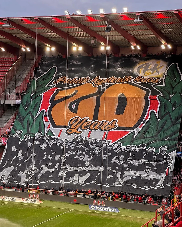 В Бельгии фанаты льежского «Стандарда» весь март отмечают 20-летие ультрас-группы «Publik Hysterik Kaos» – сначала они праздновали юбилей на домашней игре против «Гента» в начале месяца целой серией красочных баннеров. Первым баннером было полотно «РНК (аббревиатура ультрас-группы). Безумие и голос. Завтра далеко, но именно завтра нам исполняется 20 лет».